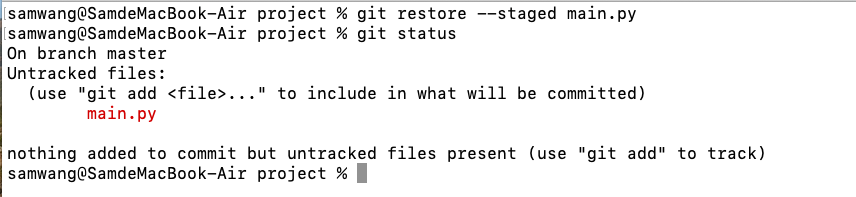 我们看,现在git提示我们git restore --staged 文件名意思是“如果你反悔了,可以将该文件取消暂存”。
