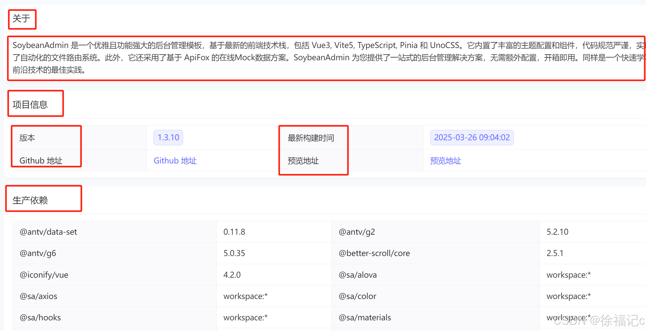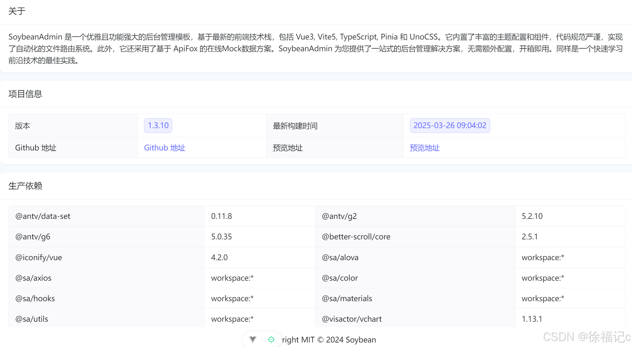 代码是一个基于 Vue 3 和 TypeScript 的组件,使用了 Naive UI 组件库。它的主要功能是展示项目信息,包括项目版本、构建时间、GitHub 链接、预览链接以及项目的依赖项(包括生产依赖和开发依赖)。代码分为逻辑部分(<script setup>)、模板部分(<template>)和样式部分(<style>)。