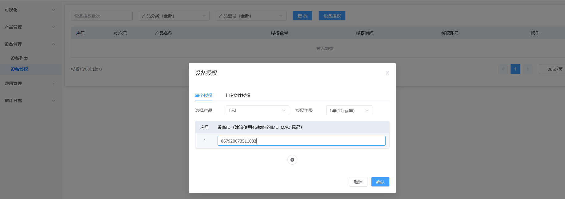 在设备管理,设备列表里面授权设备,设备编码使用设备IMEI作为编码,方便管理。新账户默认有1台1年的授权名额,用于测试,可以直接添加。