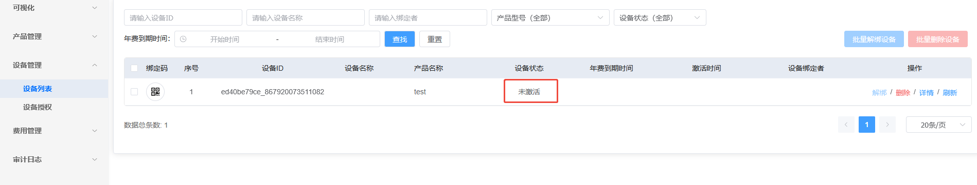在设备列表里面就会显示未激活。这时候IOT的工作已经结束了,需要在DTU平台配置硬件,然后让设备连接IOT平台。