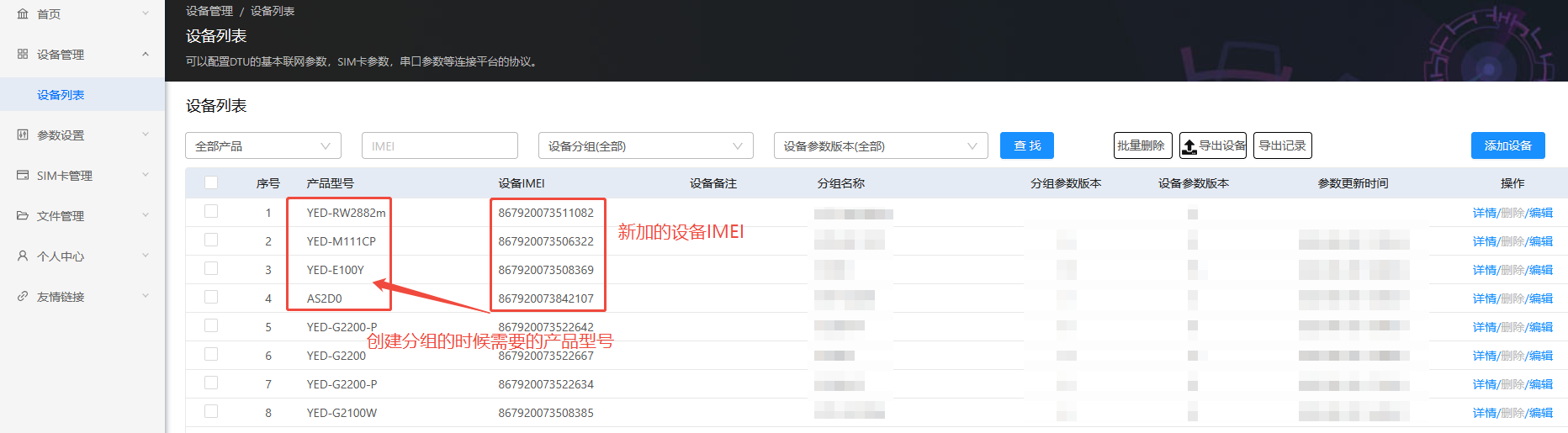 使用I微信扫码模块上的二维码,获取IMEI,MEI添加设备,添加后会有个产品型号,这个产品信号在后面的分组里面会用到。就是创建分组需要选择的分组型号。