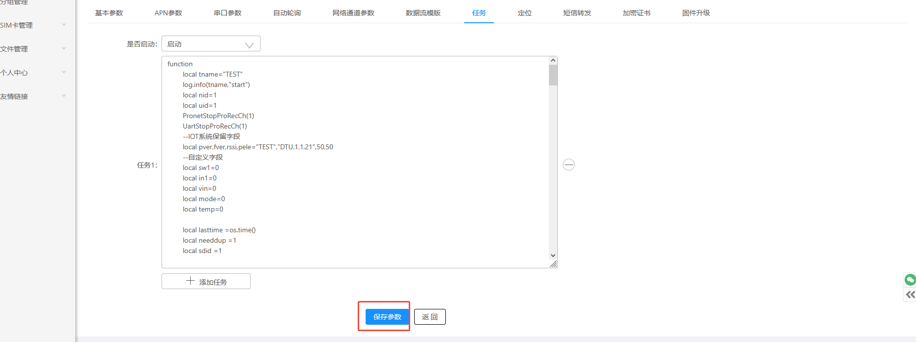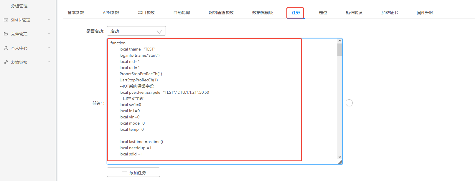 任务就是一段运行在DTU内部的代码。实现IOT平台命令的解析,赋值,数据上报。里面可以实现串口数据的读取解析,然后按IOT平台的数据规则上报就能显示。同时按IOT平台的数据格式解析就能设置参数,控制设备。