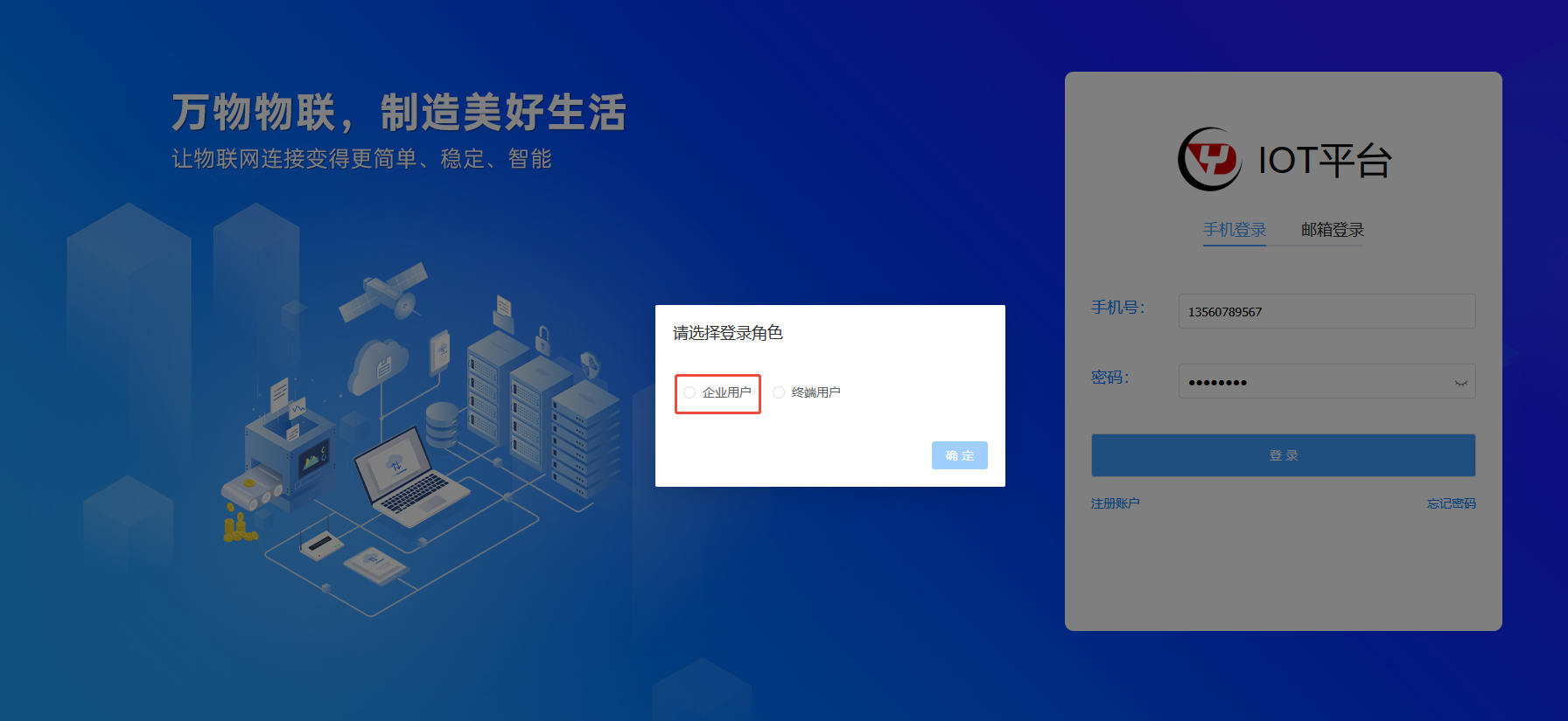 WEB注册的账户,系统默认就会注册企业角色和终端角色用户。账号登录如果是设计产品选择“企业用户”登录,如果是用产品的选择“终端用户”登录。