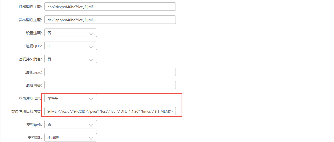注册包格式是{"cmd":"dreg","did":"0","IMEI":"${IMEI}","iccid":"${ICCID}","pver":"test","fver":"DTU_1.1.20","times":"${TIMEM}"}