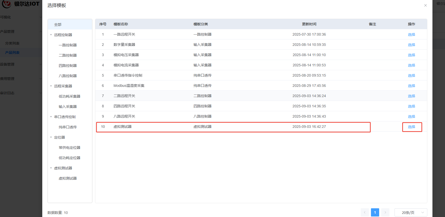 这你使用模板的创建方式,模板是银尔达提前创建的数据点和UI,直接使用,可以用来演示看现象。后续根据自己需求修改添加数据点,编辑UI等。这里以“虚拟测试器”为模板创建产品。这个“虚拟测试器”演示数据点,UI等功能,不与任何实际硬件资源相关,任何设备都可以测试。