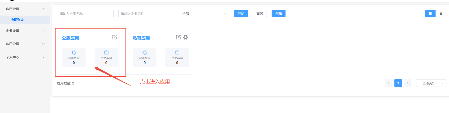 系统进入的时候默认只有一个"公版应用",匹配的是公版小程序,可以用来测试和小规模使用,对自有品牌要求不高的情况。如果要创建自己的小程序,需要创建私有应用这个需要费用。