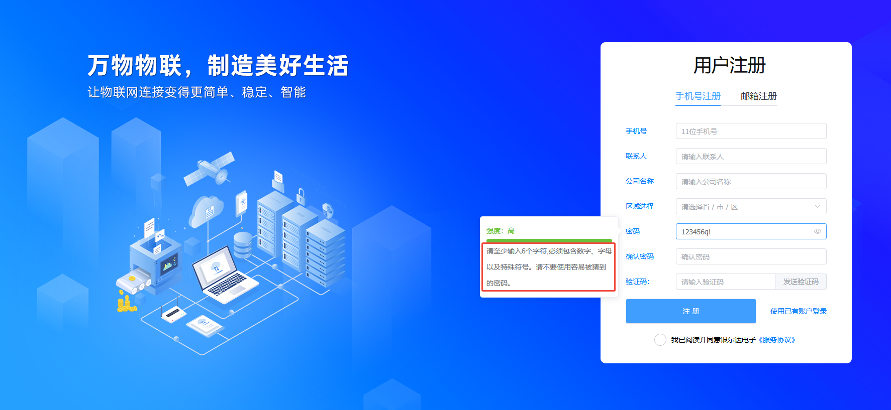 https://iot.yinerda.com 注册账号,支持手机注册要和邮箱注册。如果手机手不到验证码,就建议邮箱注册。