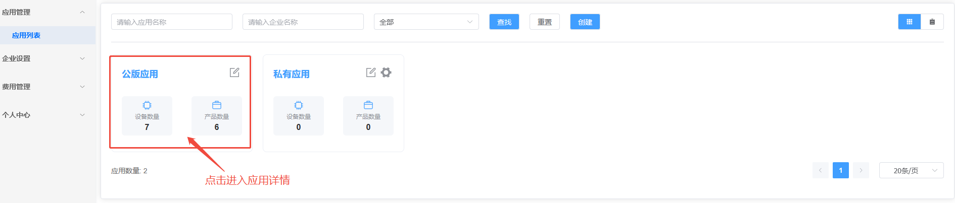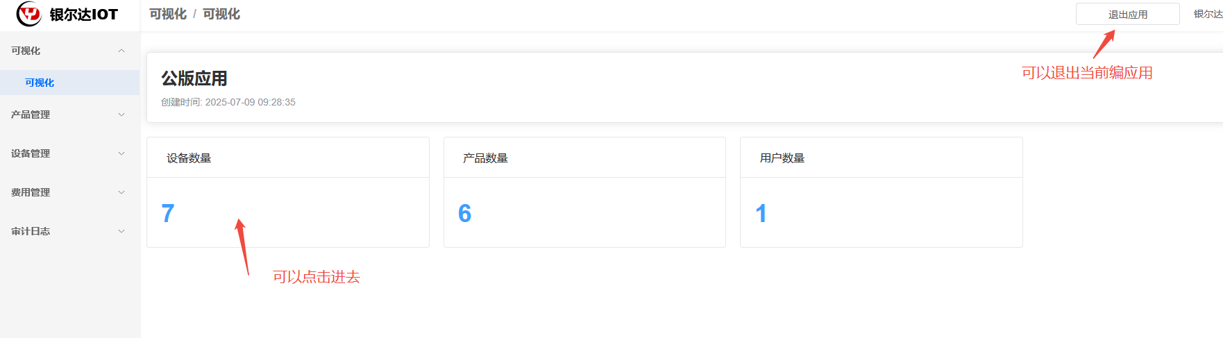 点击应用,进入应用详情,可视化目前显示了一些基本功能,设备数量,产品数量,用户数量等。