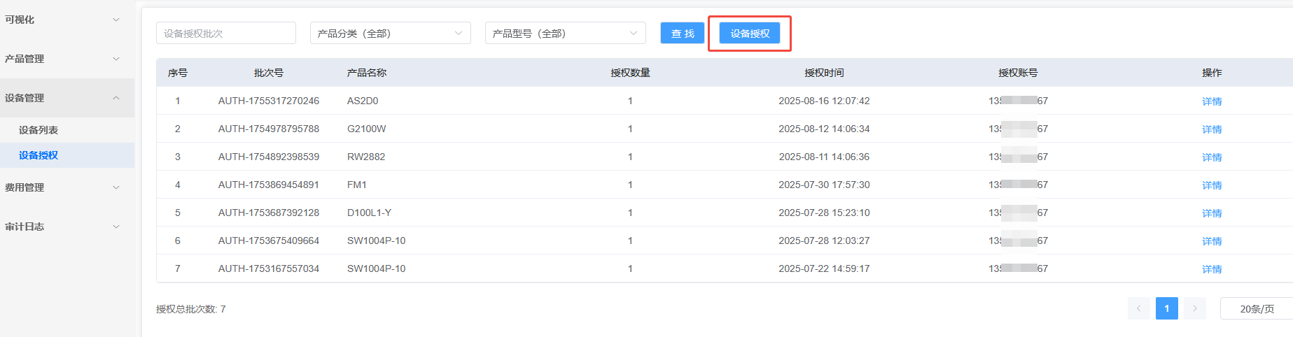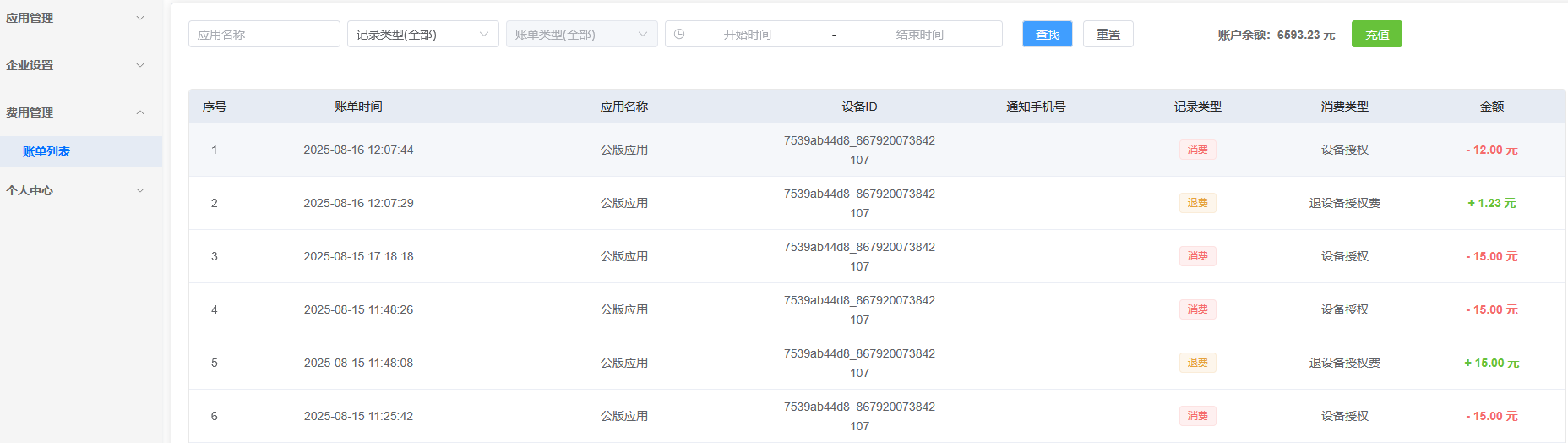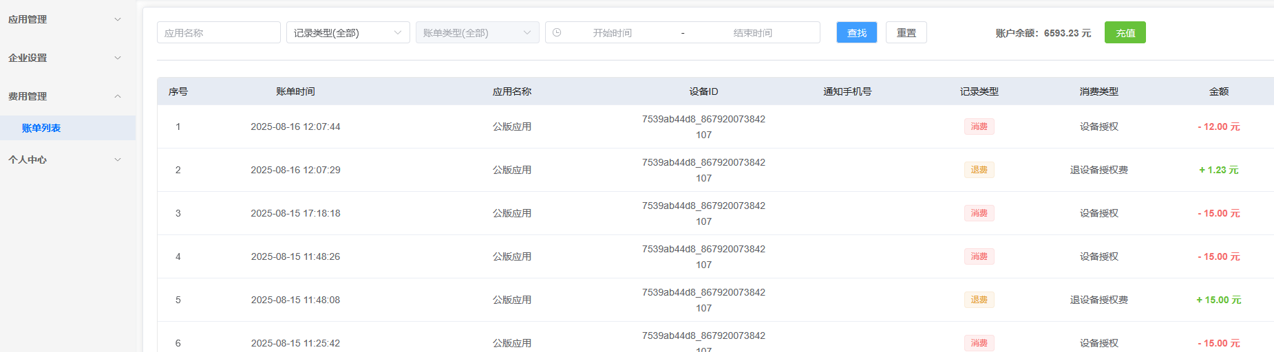 费用管理里面能看到消费的详情,包含设备授权,设备续费,退费,电话短信扣费等记录。