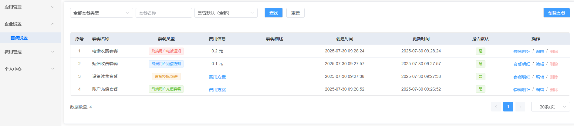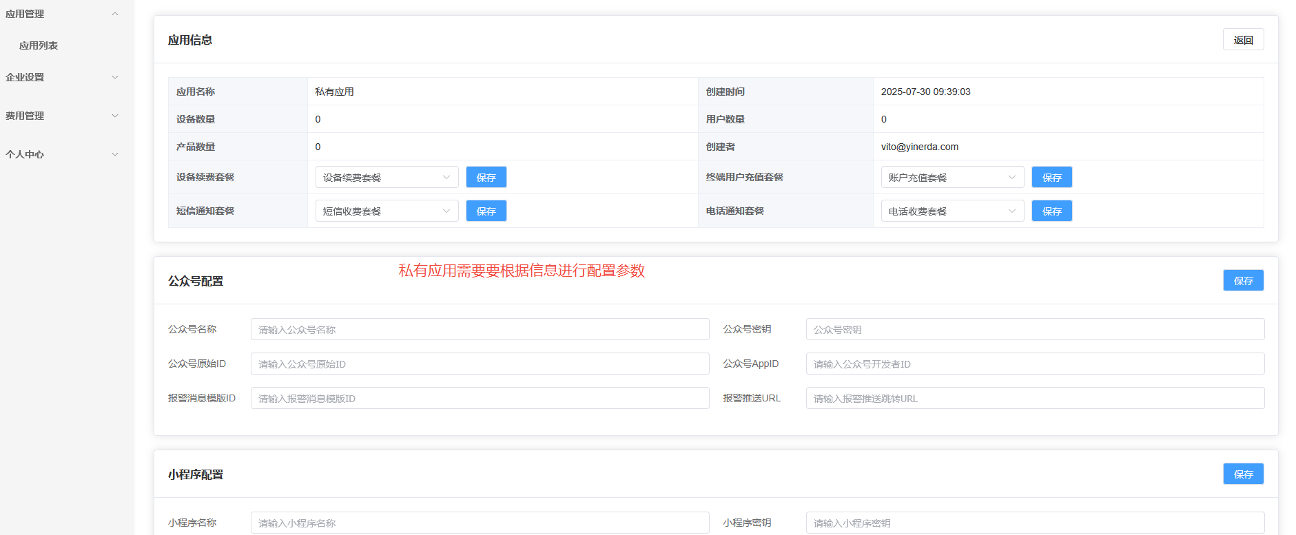 应用信息里面可以配置终端用户的续费套餐,通知套餐,充值套餐等信息。