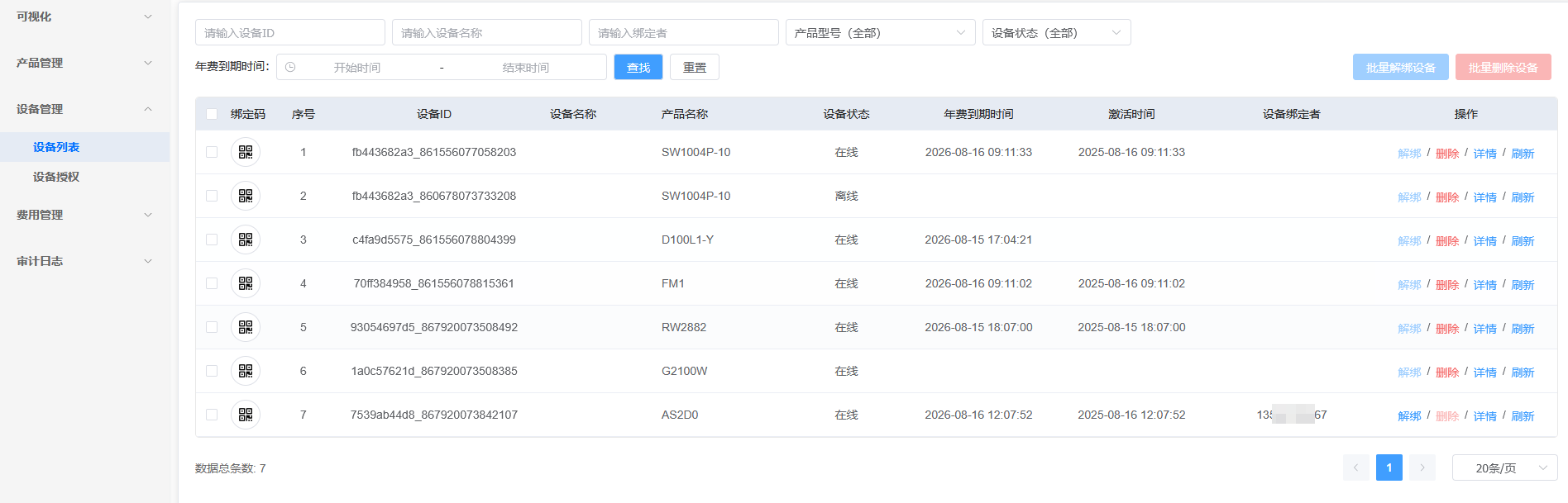 设备列表展示了自己的全部设备信息,进入详情后能调试,操作,控制设备。也可以解绑终端用户的绑定关系。