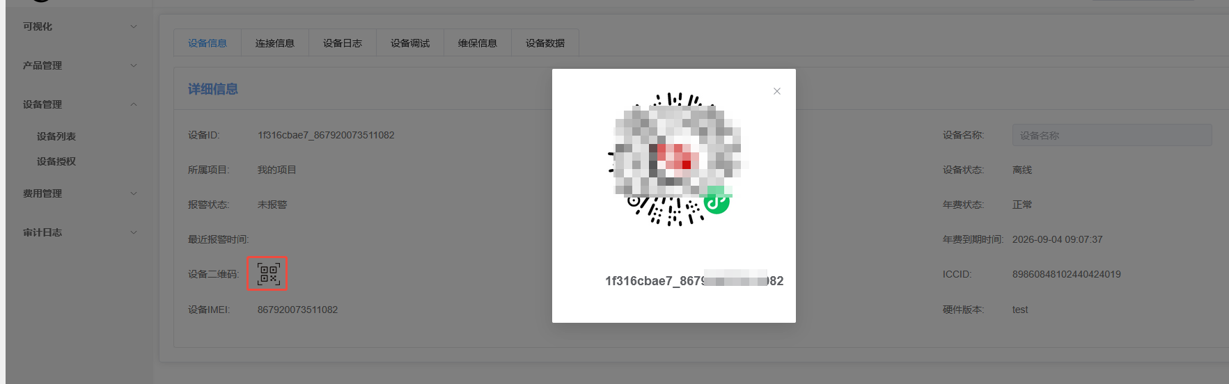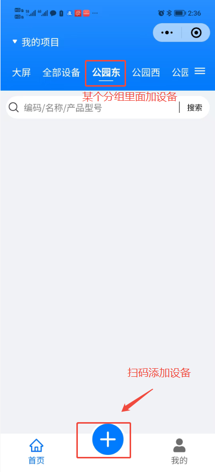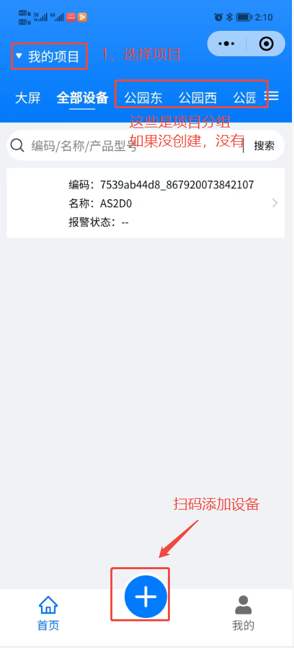 添加设备,先选择需要添加的项目,然后点击加号,扫码添加设备。扫码的二维码是IOT平台的设备二维码。这个企业用户在生产的时候,应该需要把二维码印刷到设备包装上面。