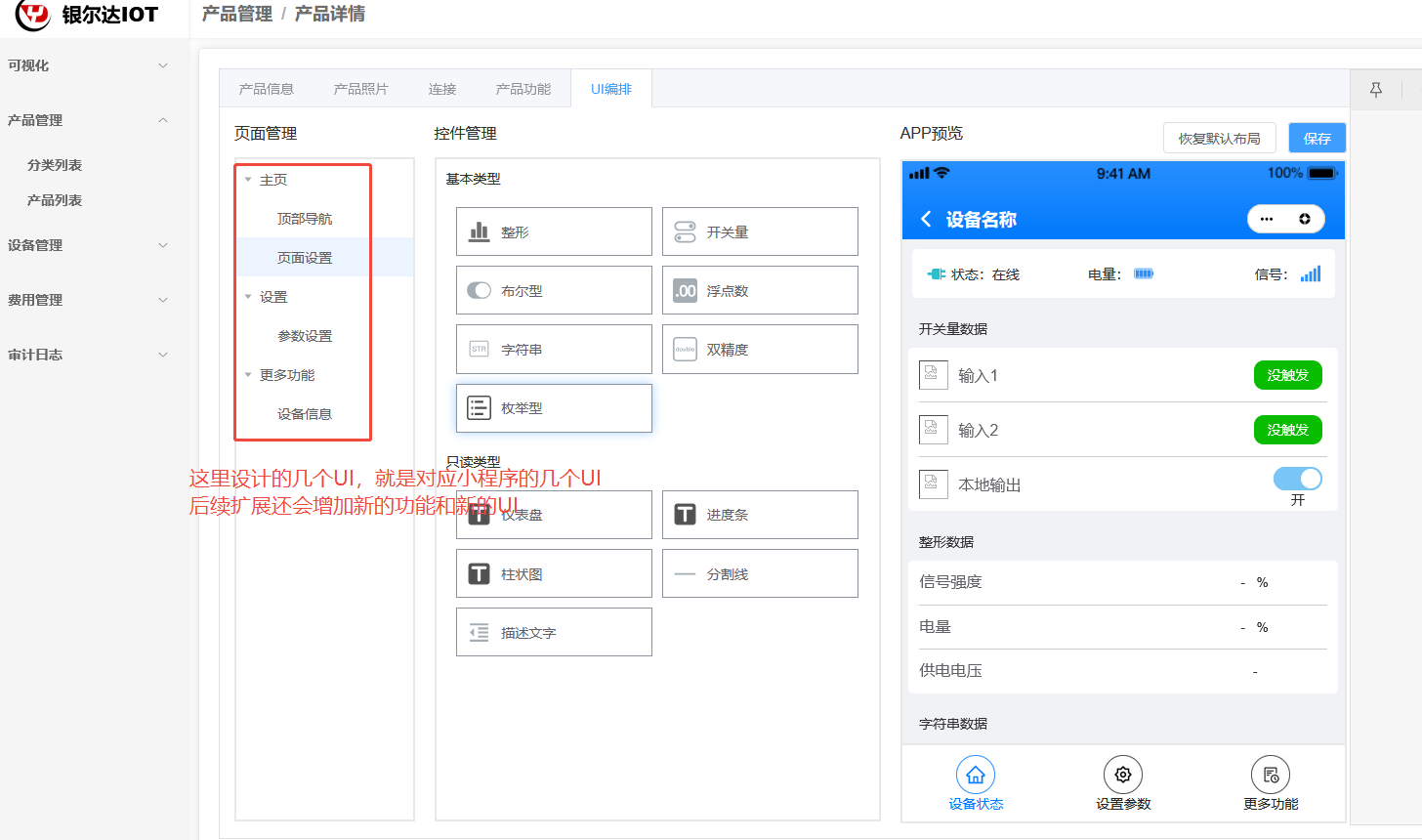 设备状态里面显示控制按钮,数据点界面。这些界面在产品创建的时候UI编辑的。包含顶导航菜单,设备状态,设置参数。其他界面功能是固定的目前不能编辑。后续会扩展更多功能。