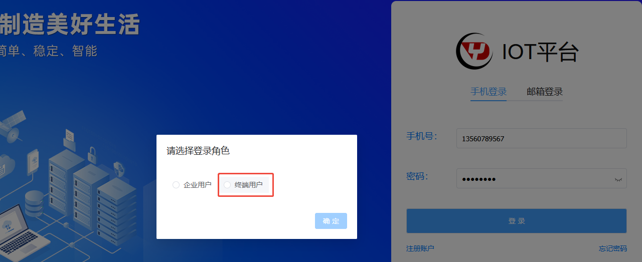 如果你是企业用户,那么默认有有个终端用户账号。登录的时候选择终端用户角色登录即可。
