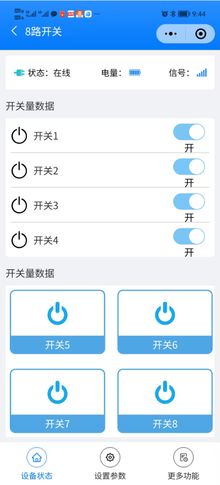 产品创建,DTU参数配置参考《平台入门实例(必看)》教程,里面讲解了完整的产品创建,数据点定义,设备授权,设备配置,参数更新等流程。然后在把本教程创建产品的时候使用模板“ 八路远程开关 ”创建,已经设置了数据点和UI,然后把下面的任务拷贝到DTU的分组任务里面,上电更新参数即可,不需要在额外操作。