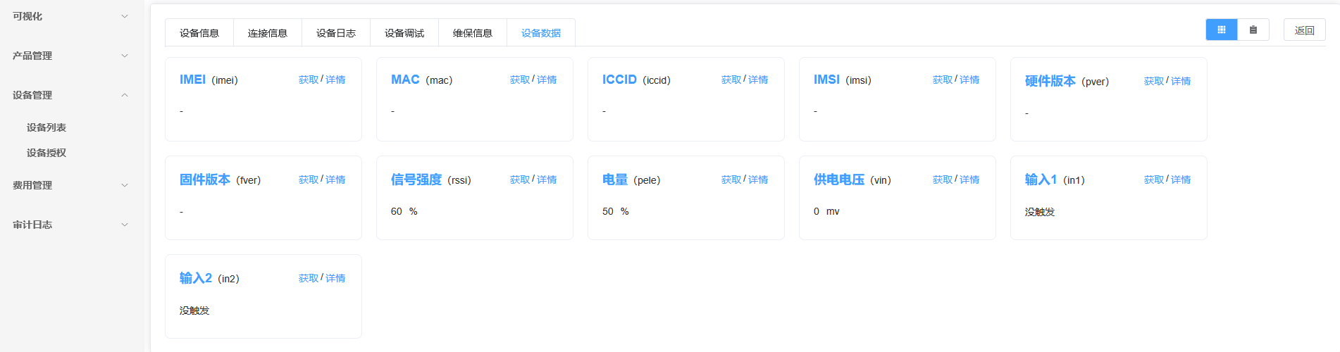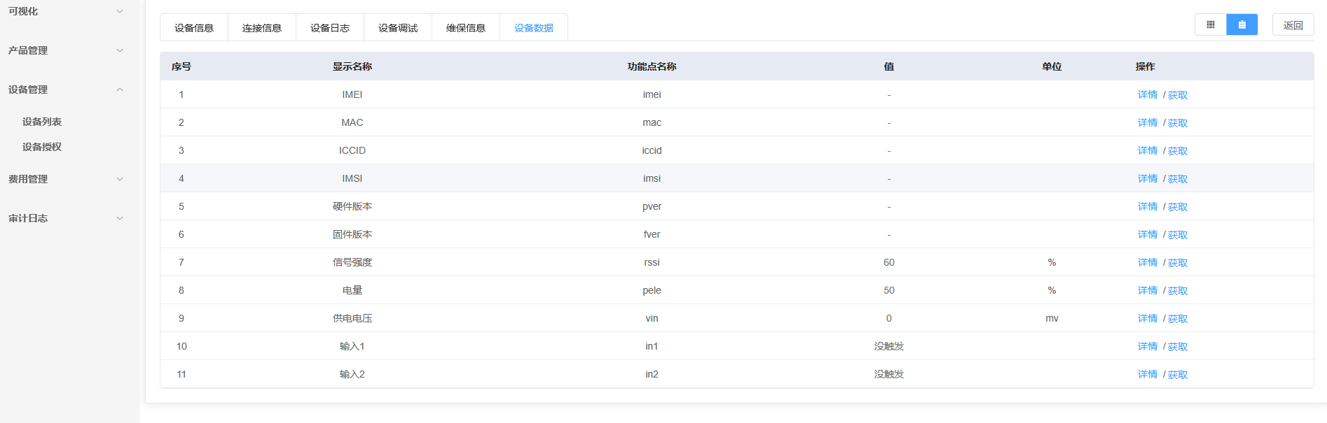 功能支持4G设备的连接,管理;支持设备数据点定义,解析,处理,储存,统计;支持微信小程序/APP管理对接;通过电话、短信、微信、邮件等报警信息通知;支持服务与服务器对接;支持服务器边缘计算数据;支持私有化部署,log替换,特殊功能定制。