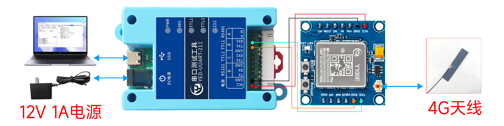 将USB线一头接电脑,一头接串口工具的USB接口,将12V1A的电源适配器给串口测试工具供电。
