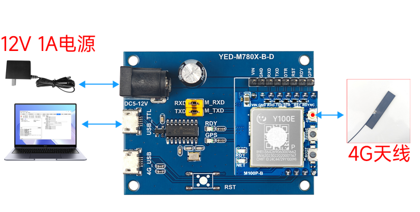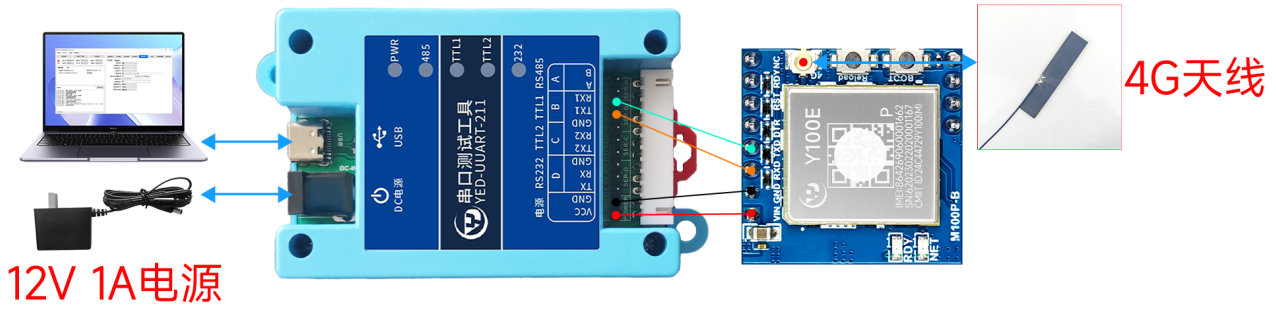 电脑安装CH340驱动;电脑USB线接USB TO TTL 接口; LET天线接好;黑色DC座接5~12V电源;电脑串口软件和测试服务器可以测试设备。