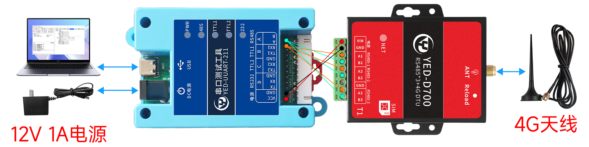 模块的VIN GND 接8~90V,10W的电源(不能用USB转串口那种电脑USB供电,功率不足);RS485 A接A,B接B;推荐使用银尔达的YED-UUART-211测试工具测试,方便供电和串口连接调试。