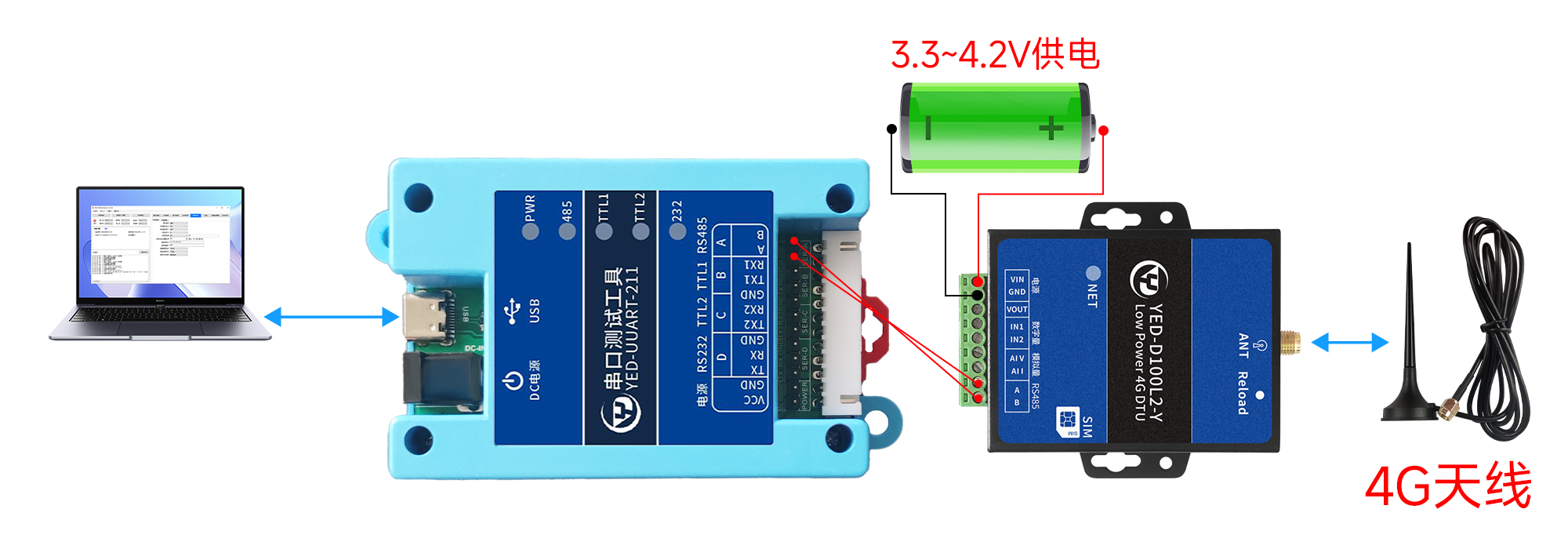 模块的VIN GND 接3.3~4.2V供电,10W的电源(不能用USB转串口那种电脑USB供电,功率不足),可以直接用锂电池供电或者稳压电源;RS485串口的A接A,B接B。推荐使用银尔达的YED-UUART-211测试工具测试,方便供电和串口连接调试。