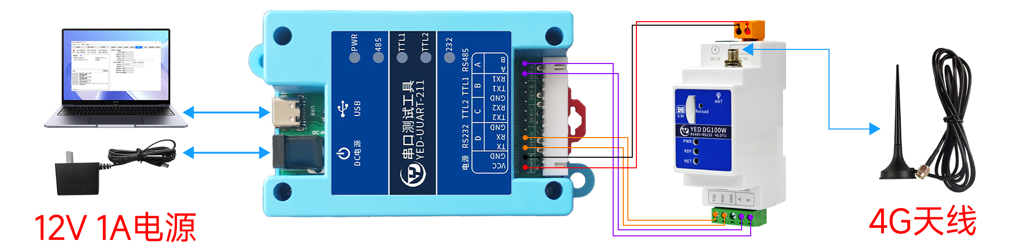模块的VIN GND 接5~36V,10W的电源(不能用USB转串口那种电脑USB供电,功率不足);RS485 A接A,B接B;RS232接口TX 接USB 串口的RX,RX接USB串口的TX,GND接USB串口的GND。推荐使用银尔达的YED-UUART-211测试工具测试,方便供电和串口连接调试。