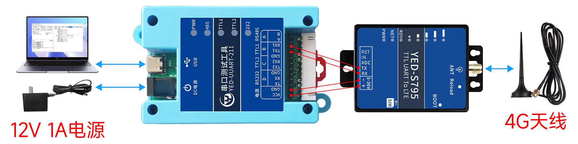 模块的VIN GND 接5~36V,10W的电源(不能用USB转串口那种电脑USB供电,功率不足);TX 接USB 串口的RX,RX接USB串口的TX,GND接USB串口的GND。推荐使用银尔达的YED-UUART-211测试工具测试,方便供电和串口连接调试。