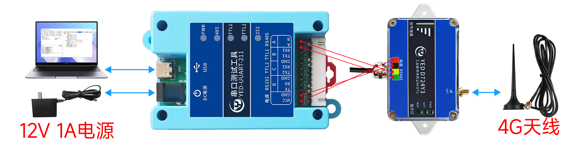 模块的VIN GND 接5~36V,10W的电源(不能用USB转串口那种电脑USB供电,功率不足);RS48接口,A接A,B接B。推荐使用银尔达的YED-UUART-211测试工具测试,方便供电和串口连接调试。