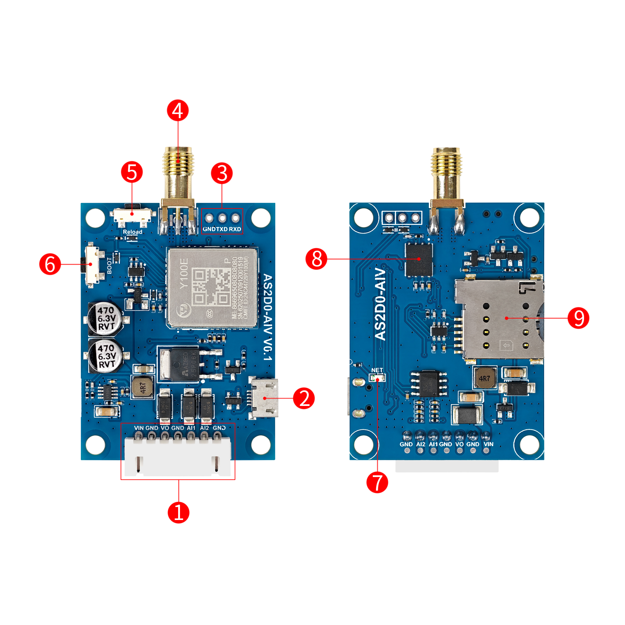 | 9 | 外置SIM卡槽 | 外置中型、自弹SIM卡,缺口向外,芯片朝模组面 |