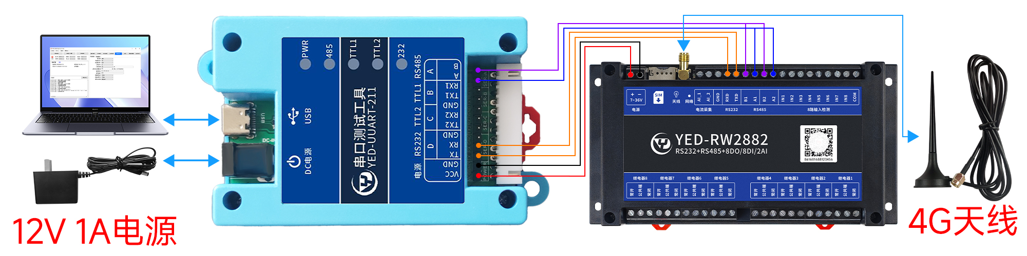 模块的VIN GND 接7~36V,10W的电源(不能用USB转串口那种电脑USB供电,功率不足);可以用RS232 TX接RX,RX接TX,GND 接GND;使用RS485是A接A,B接B;推荐使用银尔达的YED-UUART-211测试工具测试,方便供电和串口连接调试。