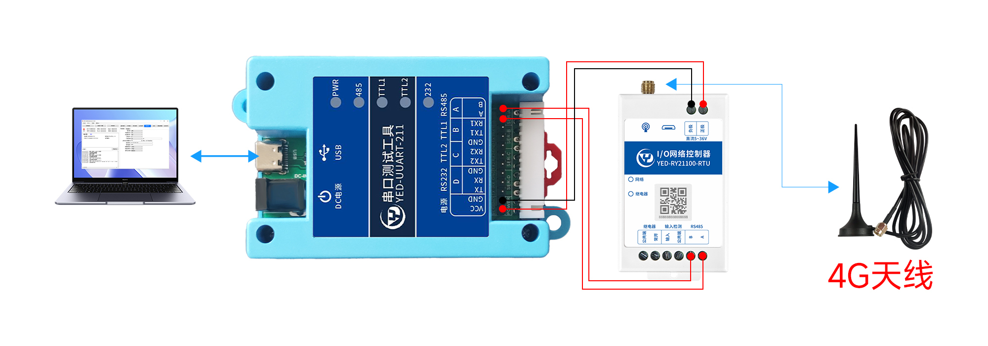 模块的VIN GND 接7~36V,10W的电源;RS485接口,A接A,B接B。推荐使用银尔达的YED-UUART-211测试工具测试,方便供电和串口连接调试。