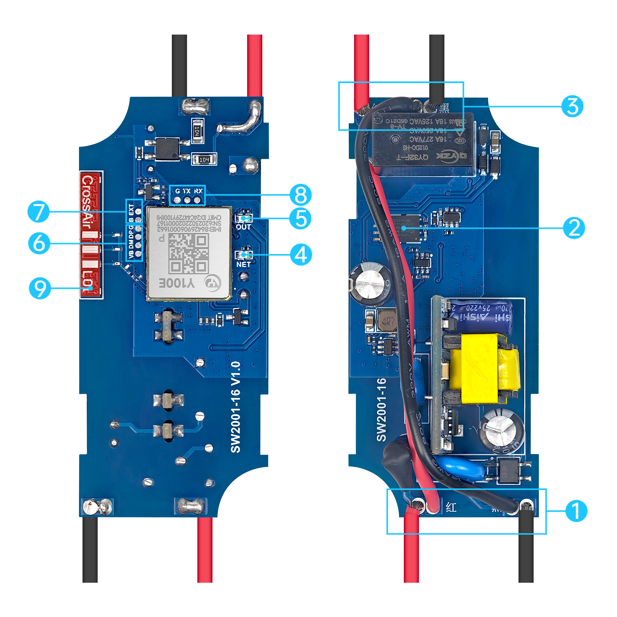 | 3 | 红 黑 | 继电器 | 打开输出供电电压,红为火线 黑为零线,最大16A (可以用输入1获取继电器状态,默认为1,有220V输出为0) |