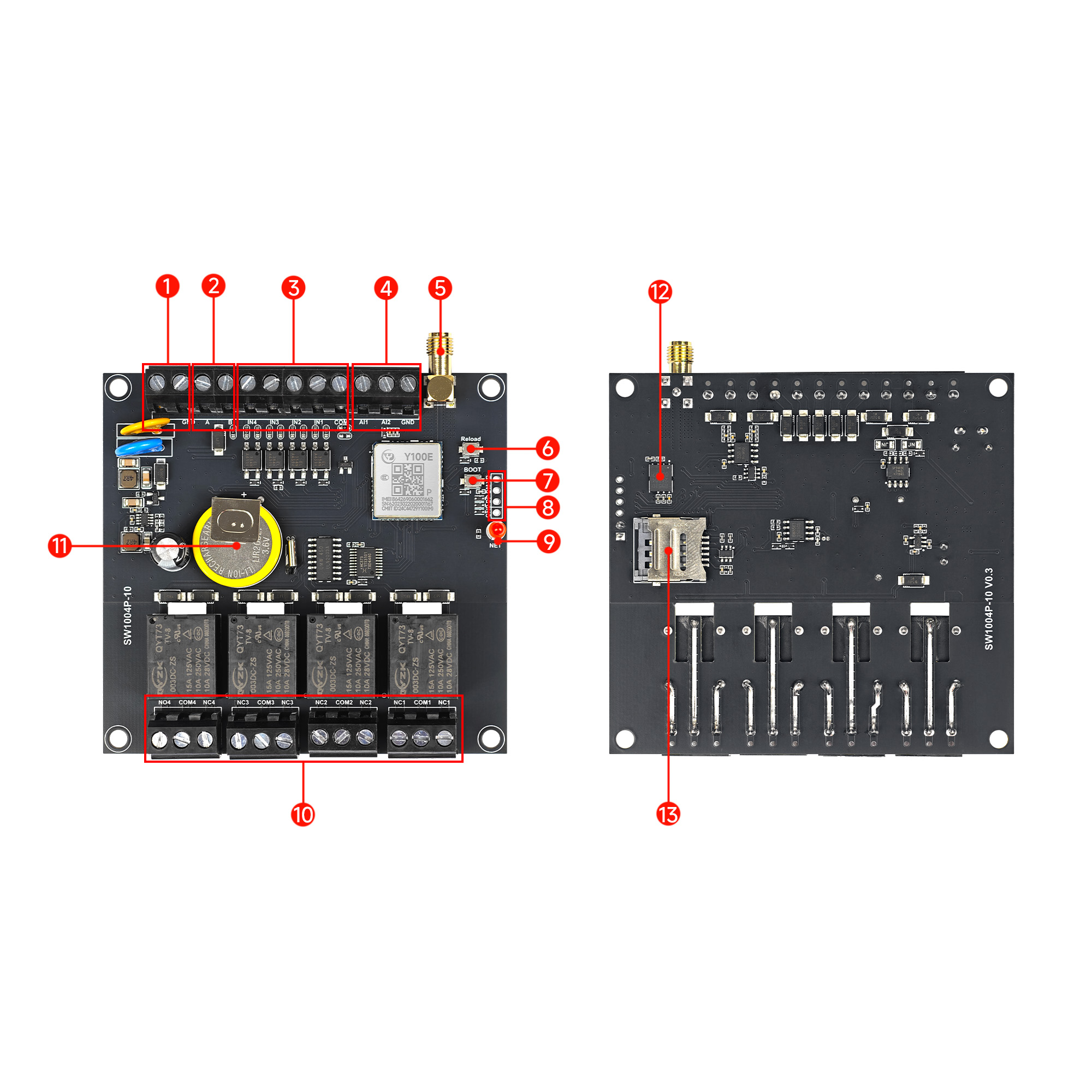 | 10 | 继电器1-4 | 继电器 | 默认COM(公共端)与NC(常闭)导通/打开后COM与NO(常开)导通 220VAC 10A /30VDC 10A |