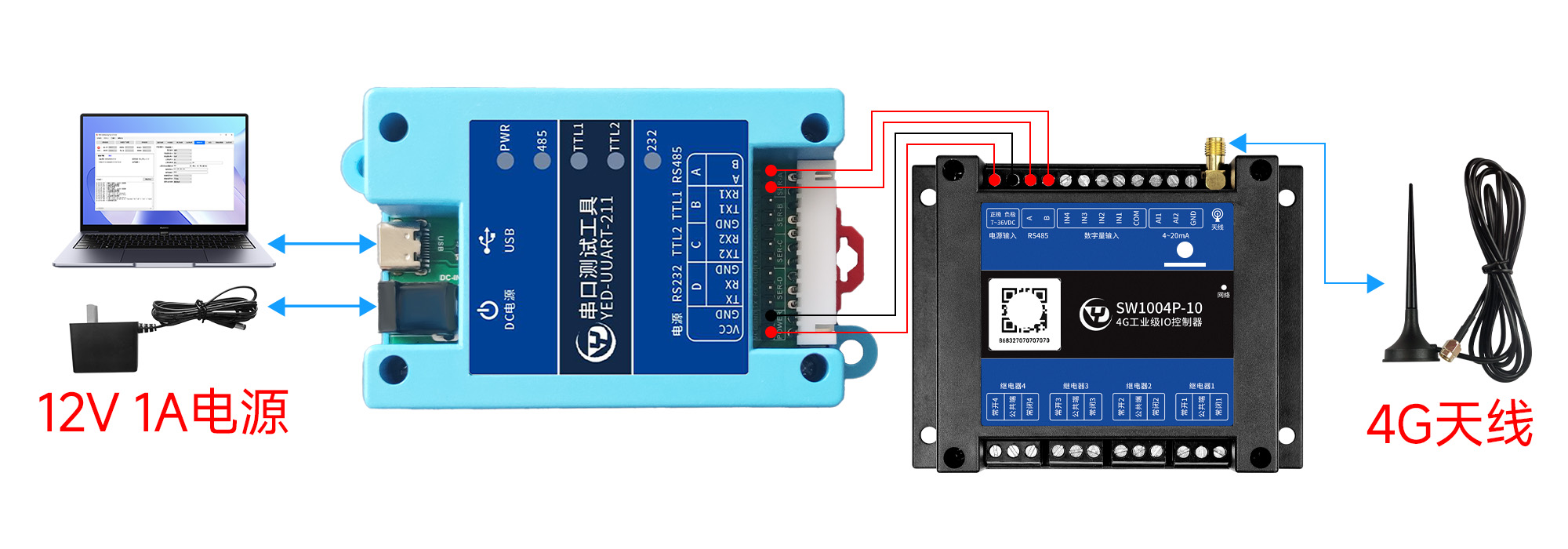 模块8~36V供电;RS485接口,A接A,B接B。推荐使用银尔达的YED-UUART-211测试工具测试,方便供电和串口连接调试。