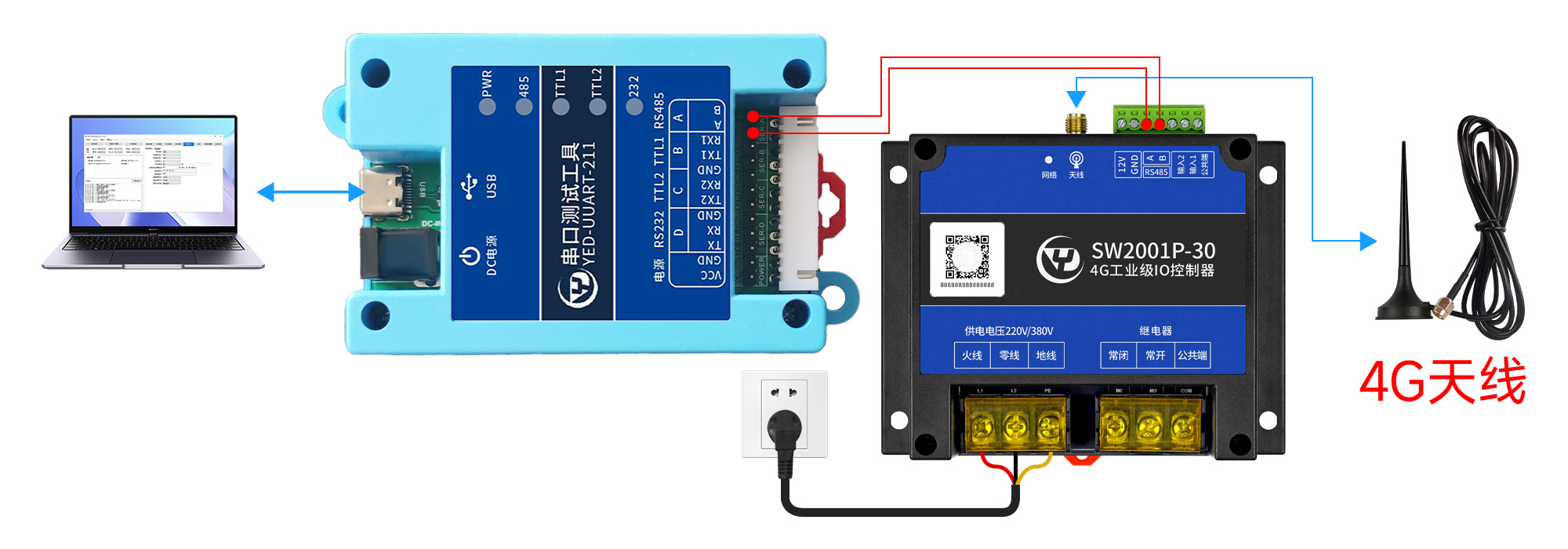 模块220V供电;RS485接口,A接A,B接B。推荐使用银尔达的YED-UUART-211测试工具测试,方便供电和串口连接调试。