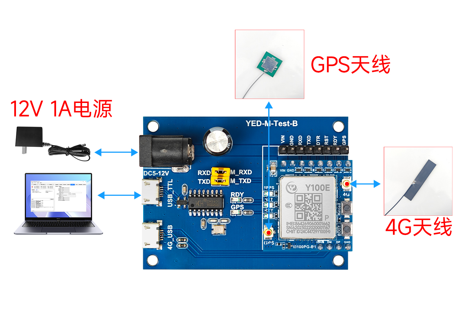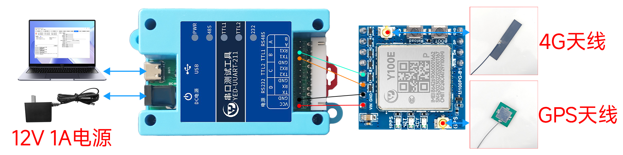 电脑安装CH340驱动;电脑USB线接USB TO TTL 接口; LET天线接好;黑色DC座接5~12V电源;电脑串口软件和测试服务器可以测试设备。