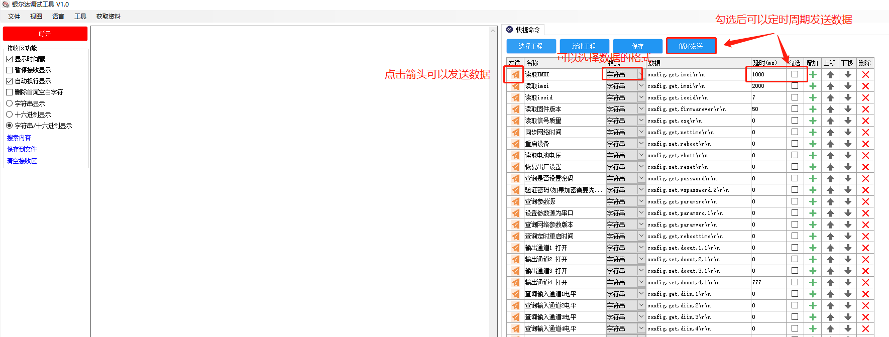 延迟与勾选,可以配合循环发送,周期发送勾选的命令,周期执行;