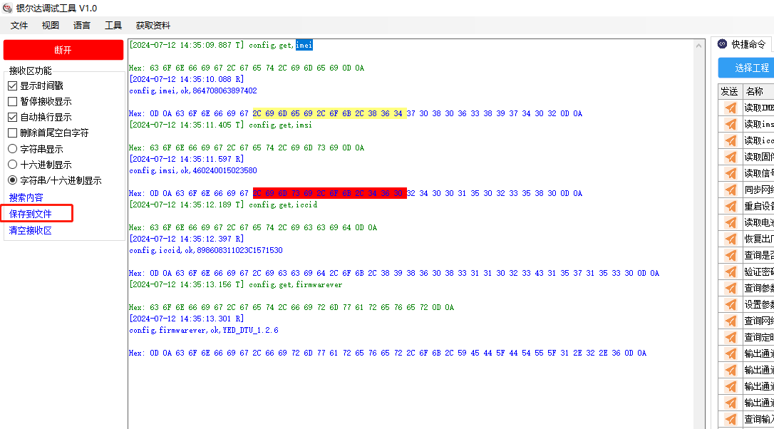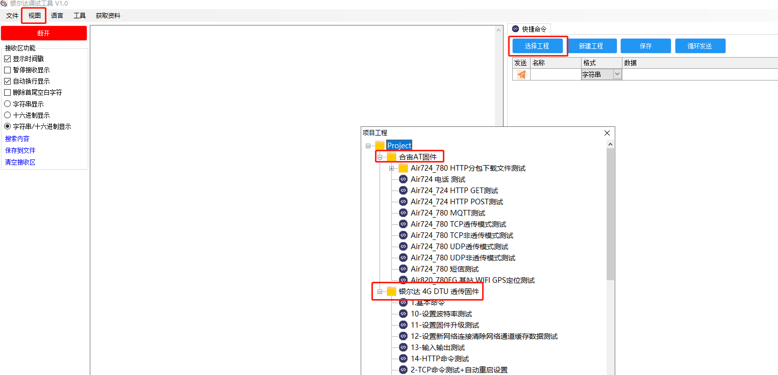 视图->快捷命令。可以打开我们常用的测试工程。比如AT工程和DTU工程。这些工程是提前写好的串口命令,方便测试。具体的命令可以参考模组的AT手册或者DTU命令手册。