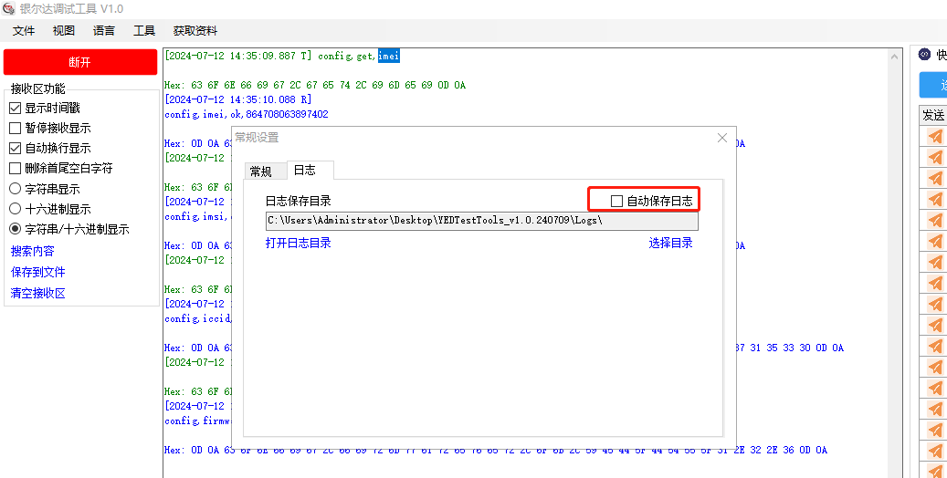 文件->常规设置->日志,勾选自动保存日志,可以自动保存接收区的数据到日志文件,每次打开软件后会自动按时间生产一个日志文件名并且保存。