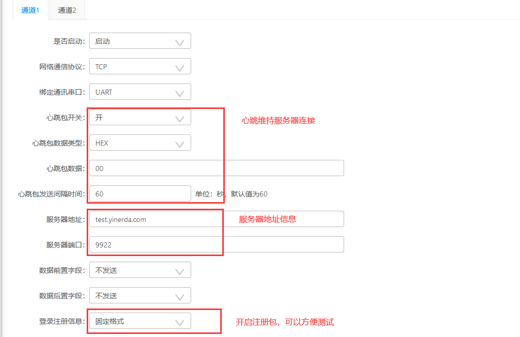 TCP协议的参数同第三节一致。只是示例代码使用的通道id为1,所以配置网络通道必须要选择通道1配置服务器。
