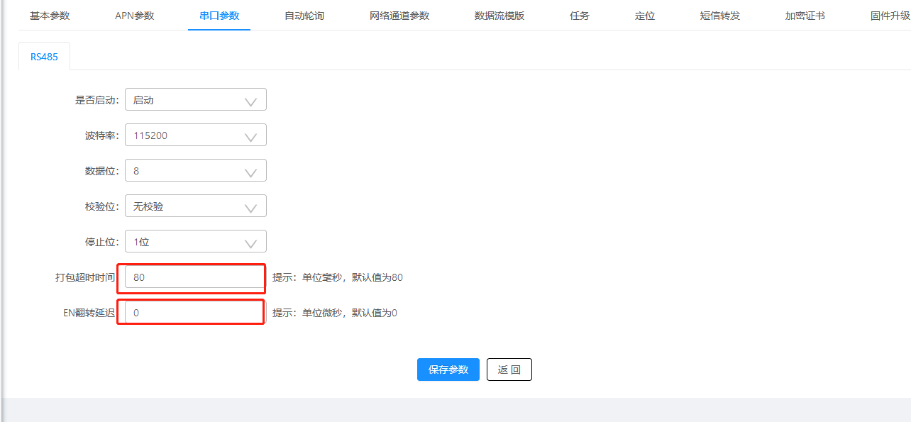 根据设备的波特率配置。注意RS485,可能需要调整EN翻转时间,当数据有乱码的时候,Air724系列调整成1,Air780E,Air780EP,Y100P 系列调整成5000~20000在试试。