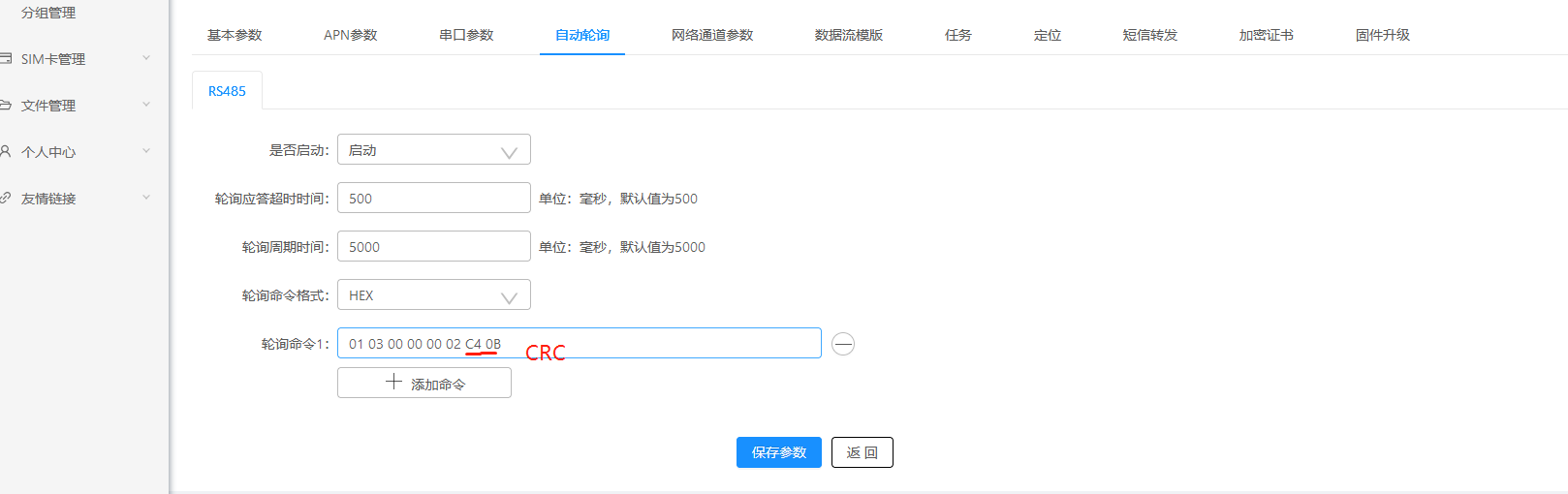 自动轮询是在DTU上面配置固定轮询命令,DTU就会自动发送这些命令到串口,如果接的设备和传感器应答了命令,DTU就会把应答的数据透传到服务器,节省服务器轮询的压力和流量。这种只适合单个设备,单条命令这种;或者多个设备,每个设备一个命令;如果一个设备,多个命令,命令长度一样,服务器是无法区分对应命令。这种场景一般需要任务实现。