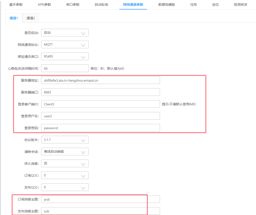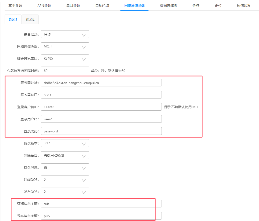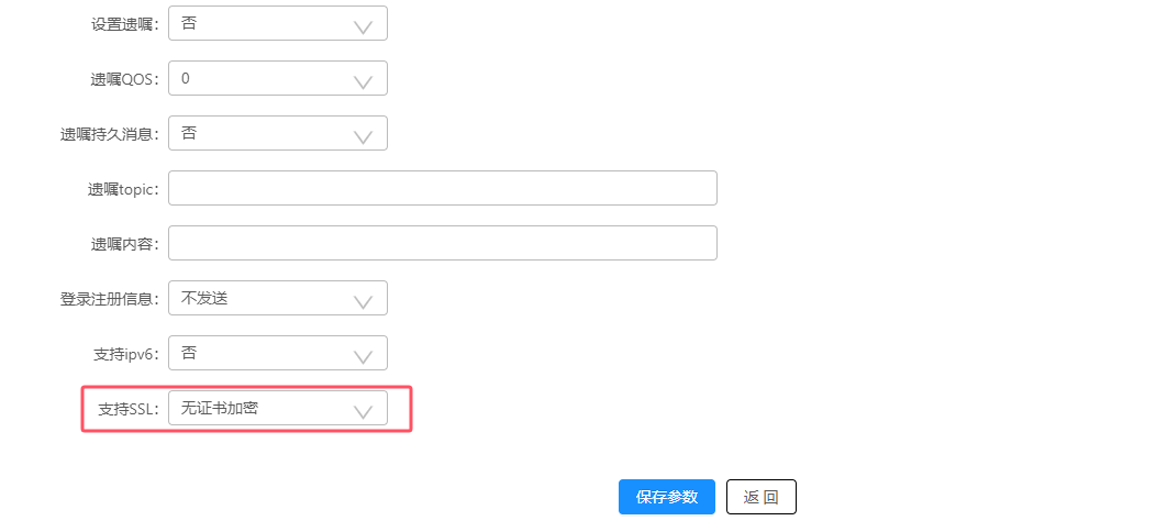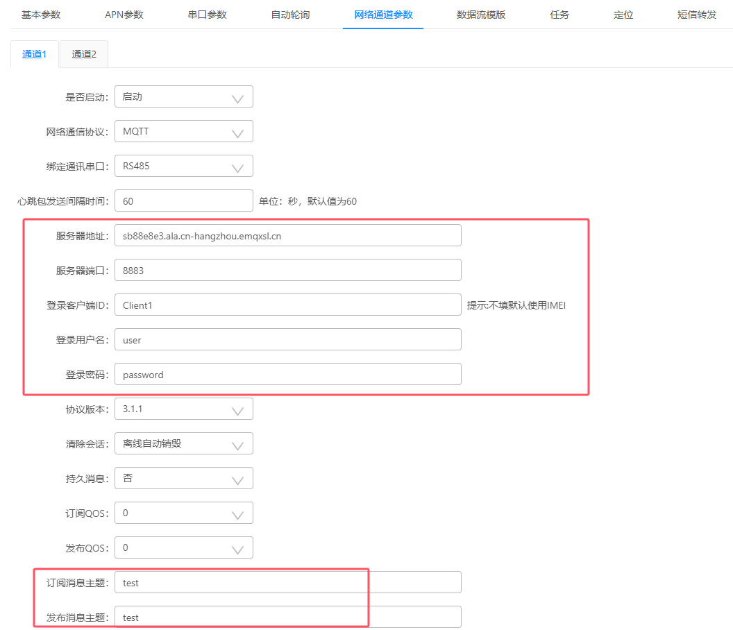 在“网络通道参数”界面根据我们部署的EMQX参数填写MQTT参数,订阅和发布都使用“test”,SSL方式选择无证书加密。