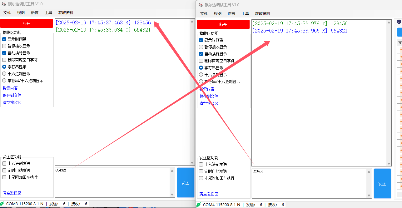 打开两个银尔达串口工具,分别连接两个客户端的串口,可以看到两个客户端实现了数据的转发。