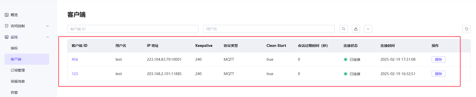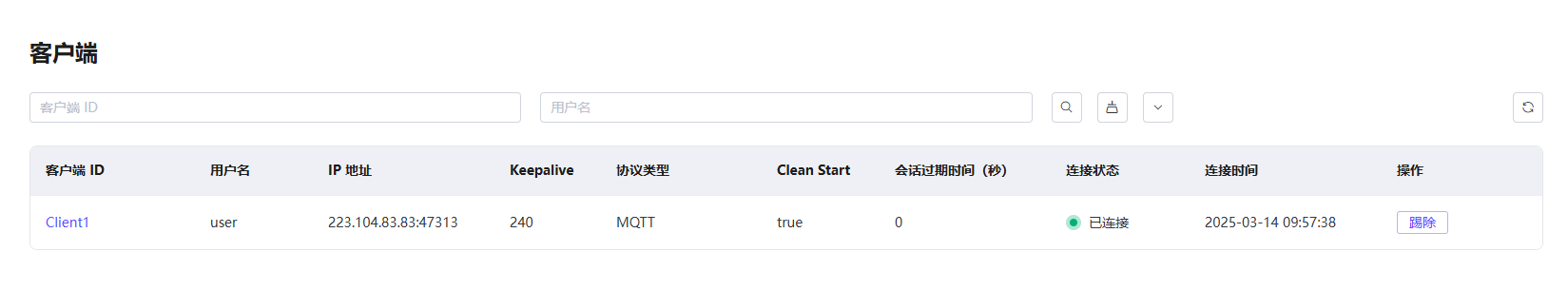 设备正常更新参数后,在监控-客户端可以看到客户端已连接。