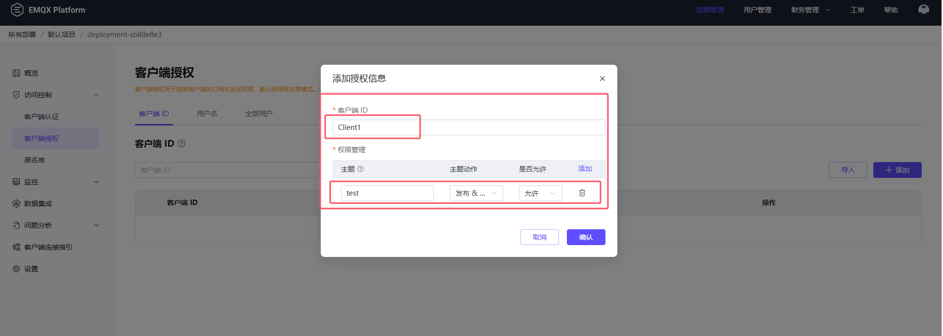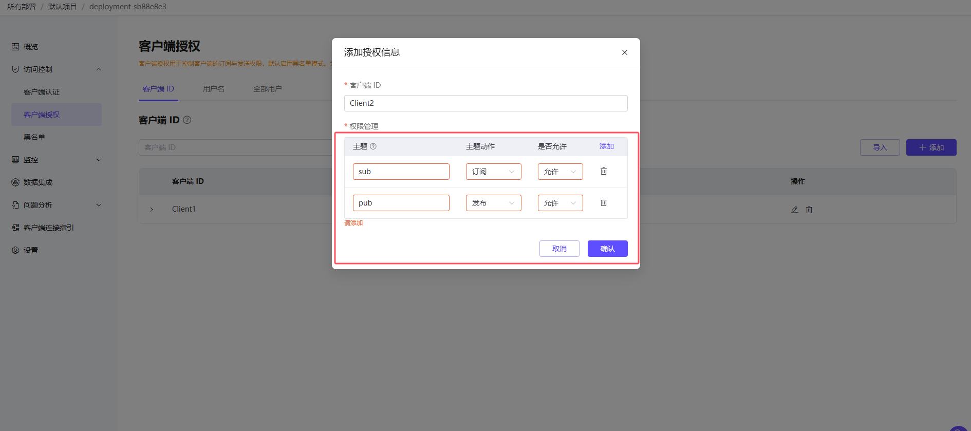 在访问控制-客户端授权中添加允许连接的客户端,客户端ID“Client1”,topic“test”定义为发布&订阅