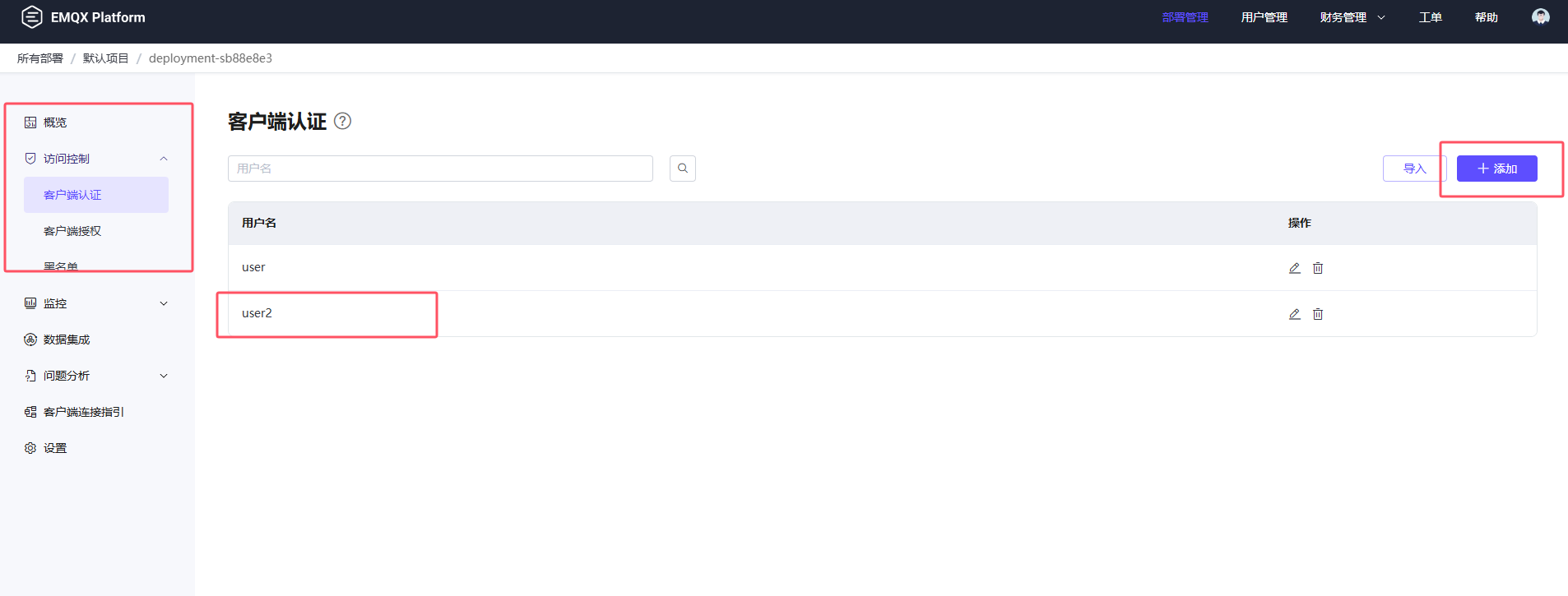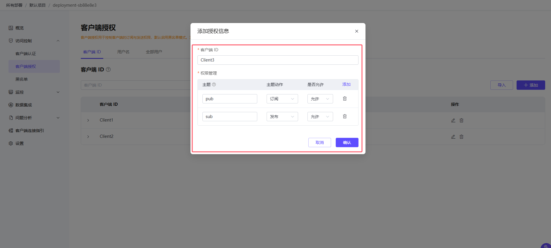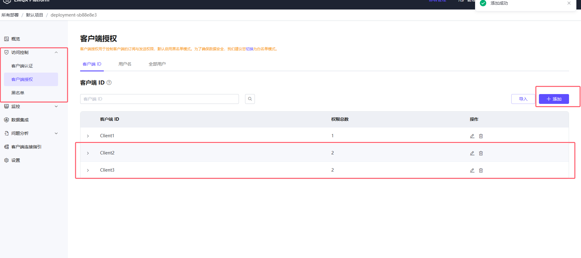 在EMQX客户端授权两个客户端,“Client2”和“Client3”