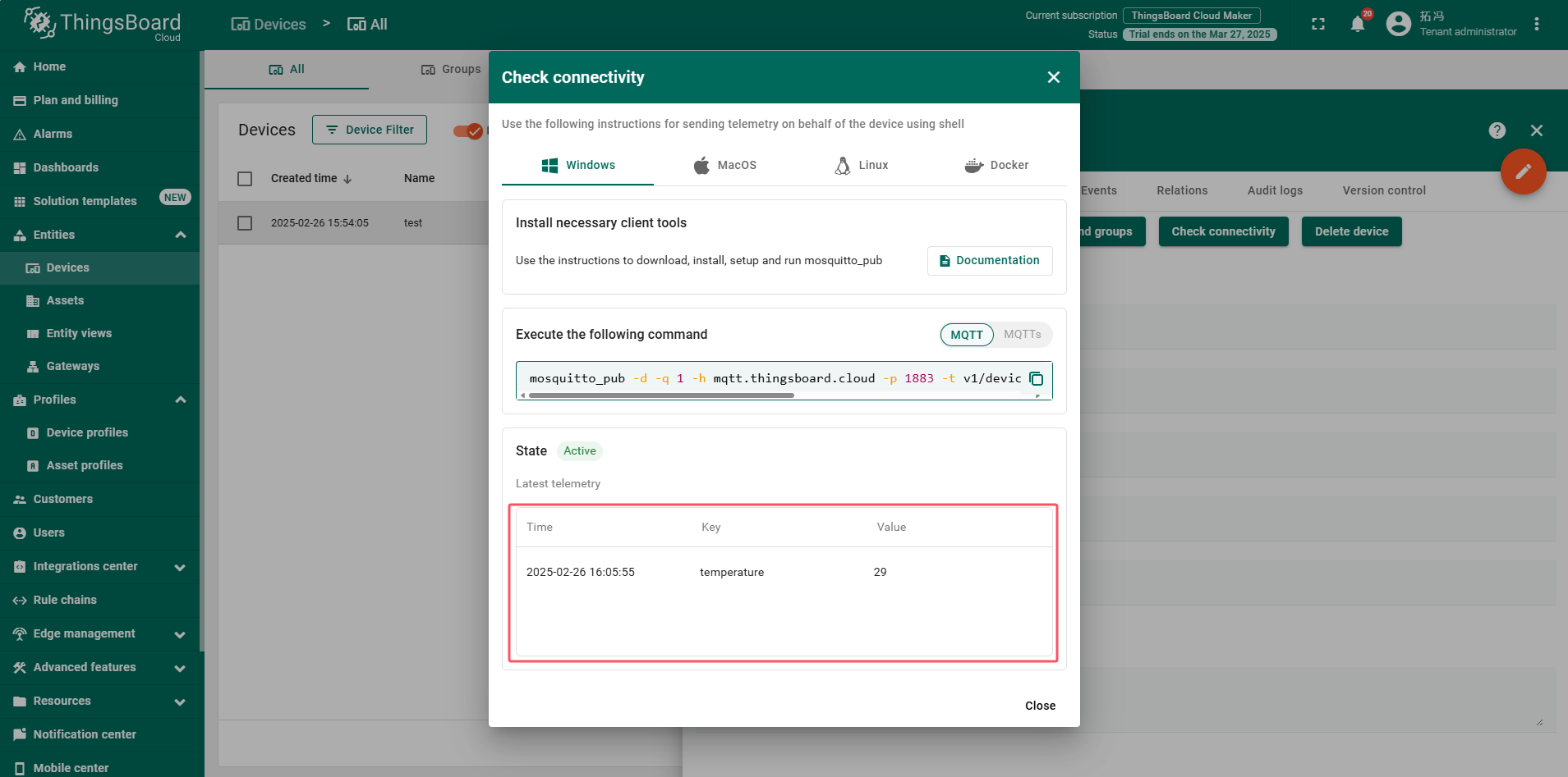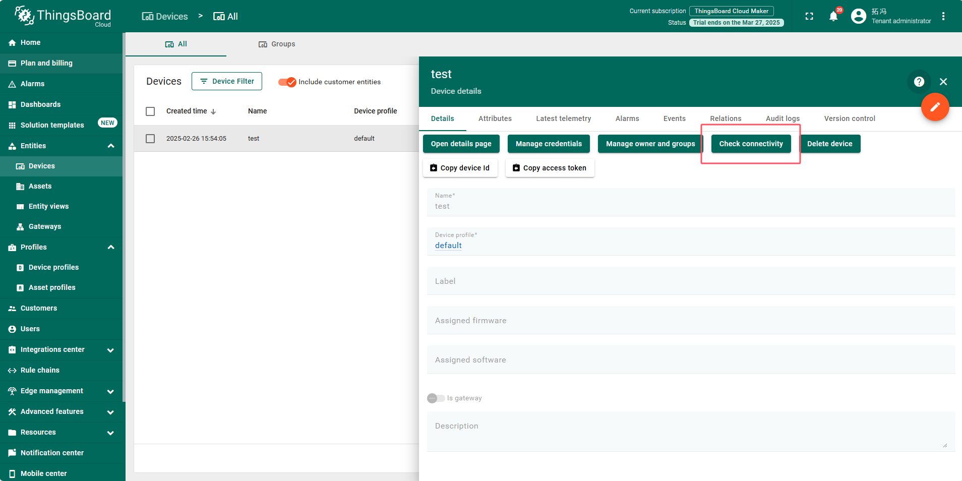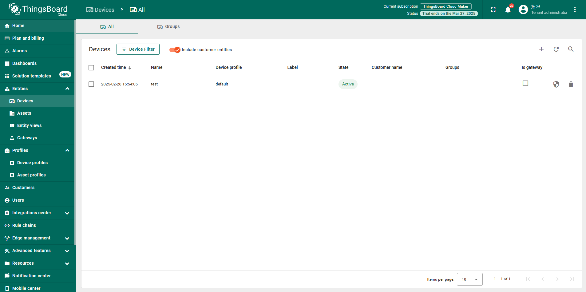参数更新后,刷新页面,可以看到DTU成功连接到ThingsBoard Cloud,