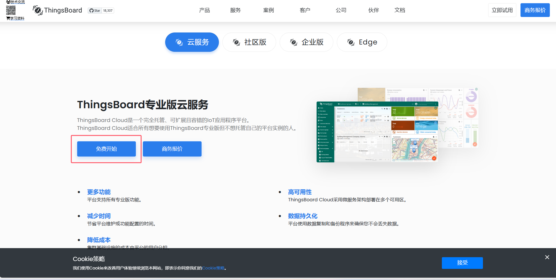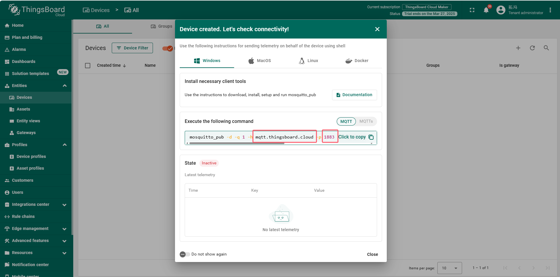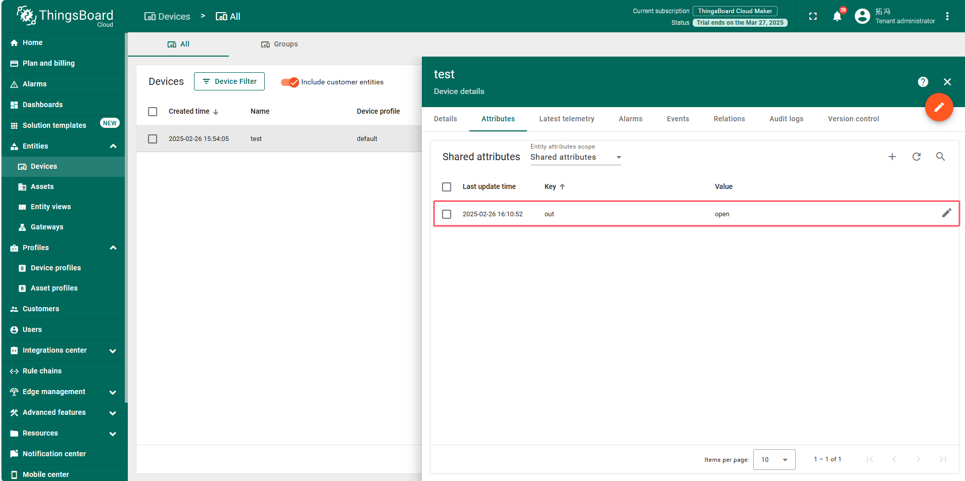 参数更新后,刷新页面,可以看到DTU成功连接到ThingsBoard Cloud,