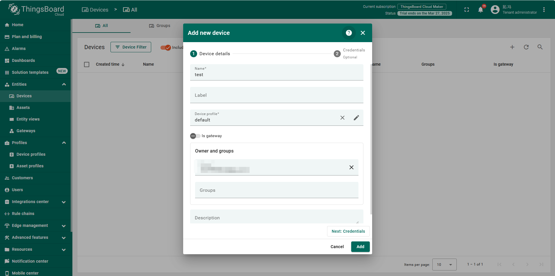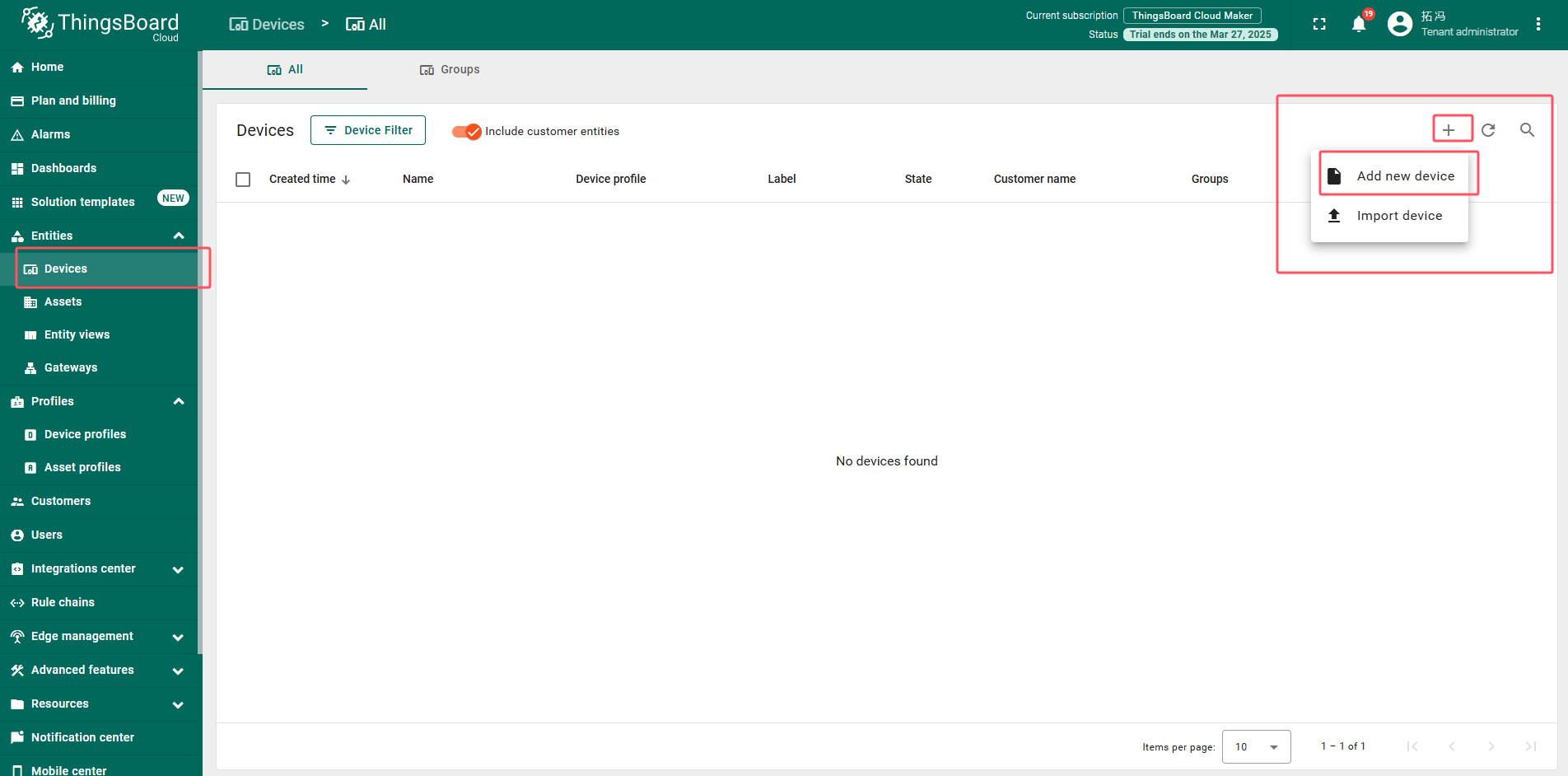 登录到您的 ThingsBoard 实例并转到 “Entities” 部分的 “Devices” 页面,单击表格右上角的“+”图标,然后从下拉菜单中选择“添加新设备”。