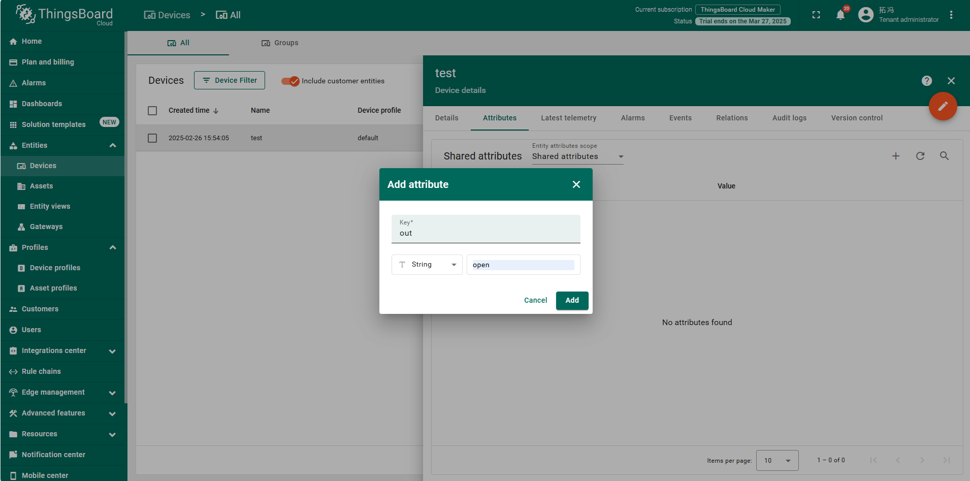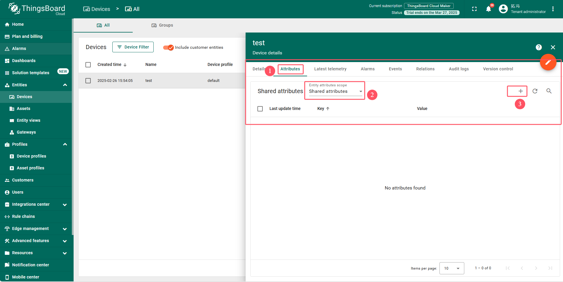点击设备进入详情,点击“Attributes”,选择“Shared attributes”,点击加号添加。